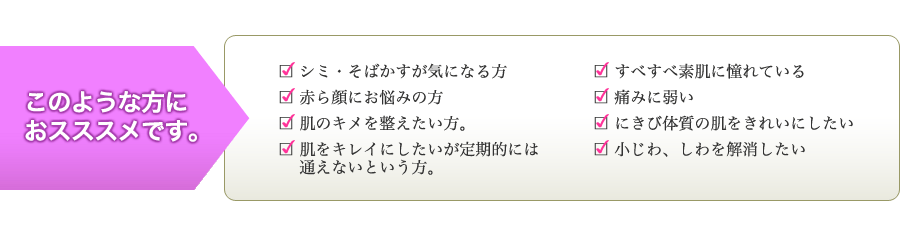 など、不安要因が多々あります。 実際にフォトフェイシャルを体験して頂き、本格的なコース施術へ移るための不安を解消することを目的に実施しております。